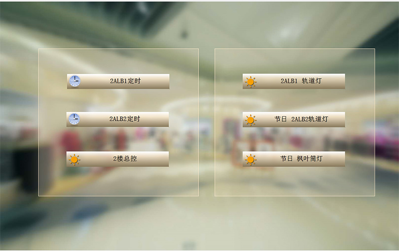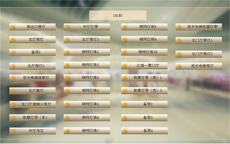 智能照明公共照明控制界面見(jiàn)下圖,主要實(shí)現(xiàn)公共照明控制,可統(tǒng)一控制,也可單獨(dú)控制,控制狀態(tài)可在界面上直接顯示出來(lái),同時(shí)可以設(shè)置各照明回路自動(dòng)亮滅時(shí)間。
