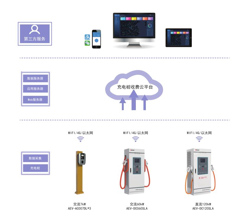 充電樁可選配WIFI/4G/以太網(wǎng)接入互聯(lián)網(wǎng),配合加密技術(shù)和秘鑰分發(fā)技術(shù),基于TCP/IP的數(shù)據(jù)交互協(xié)議,與云端進(jìn)行直連。云平臺(tái)包含了充電收費(fèi)和充電樁運(yùn)營(yíng)的所有功能,包括財(cái)務(wù)管理、變壓器監(jiān)控和運(yùn)營(yíng)分析等功能。