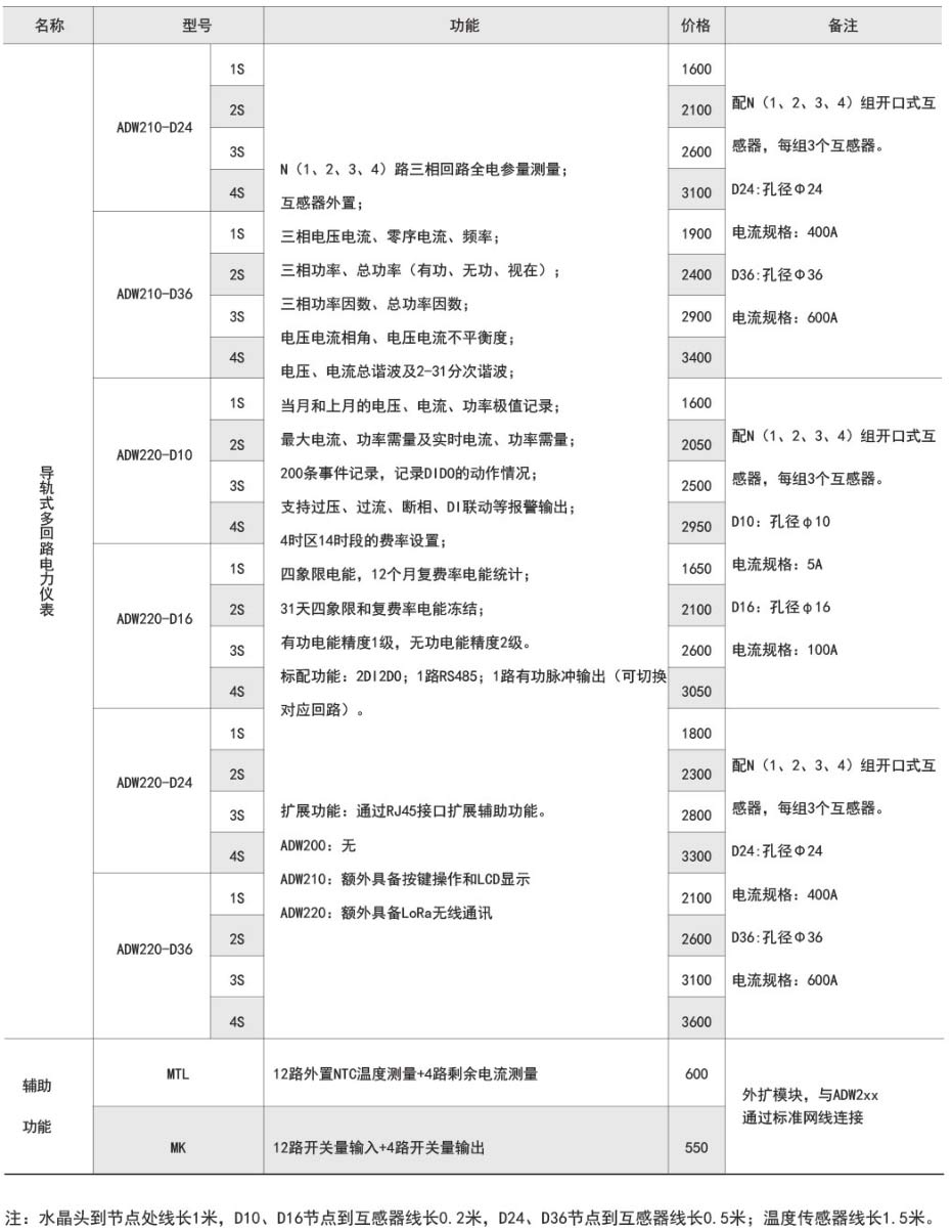 ADW2xx系列導軌式多回路電力儀表主要用于低壓三相回路全電參量測量,同時可選擇四個回路的電流輸入。可直接或間接測量電壓、電流、功率、功率因數、相角、不平衡度、諧波等參數。 還可通過其RJ45接口擴展輔助功能,實現DI、DO、測溫、剩余電流測量,以及2G、4G、LoRa、LoRaWan、NB-Lot無線通信功能。